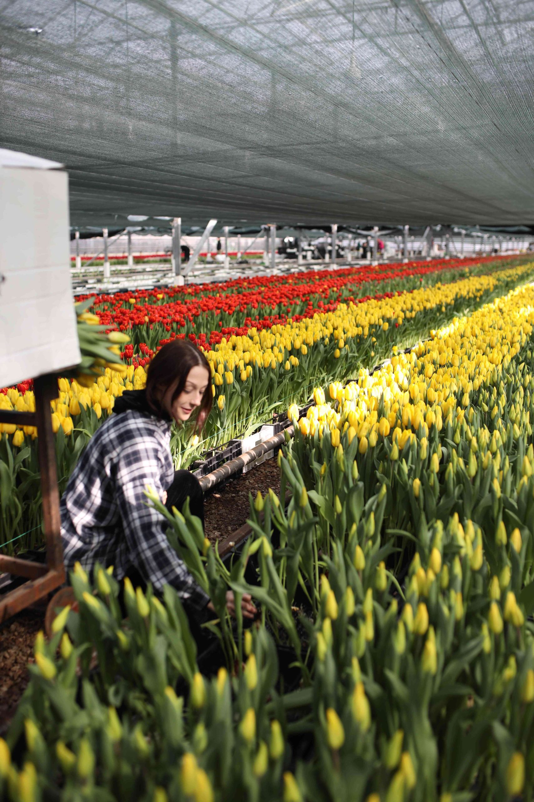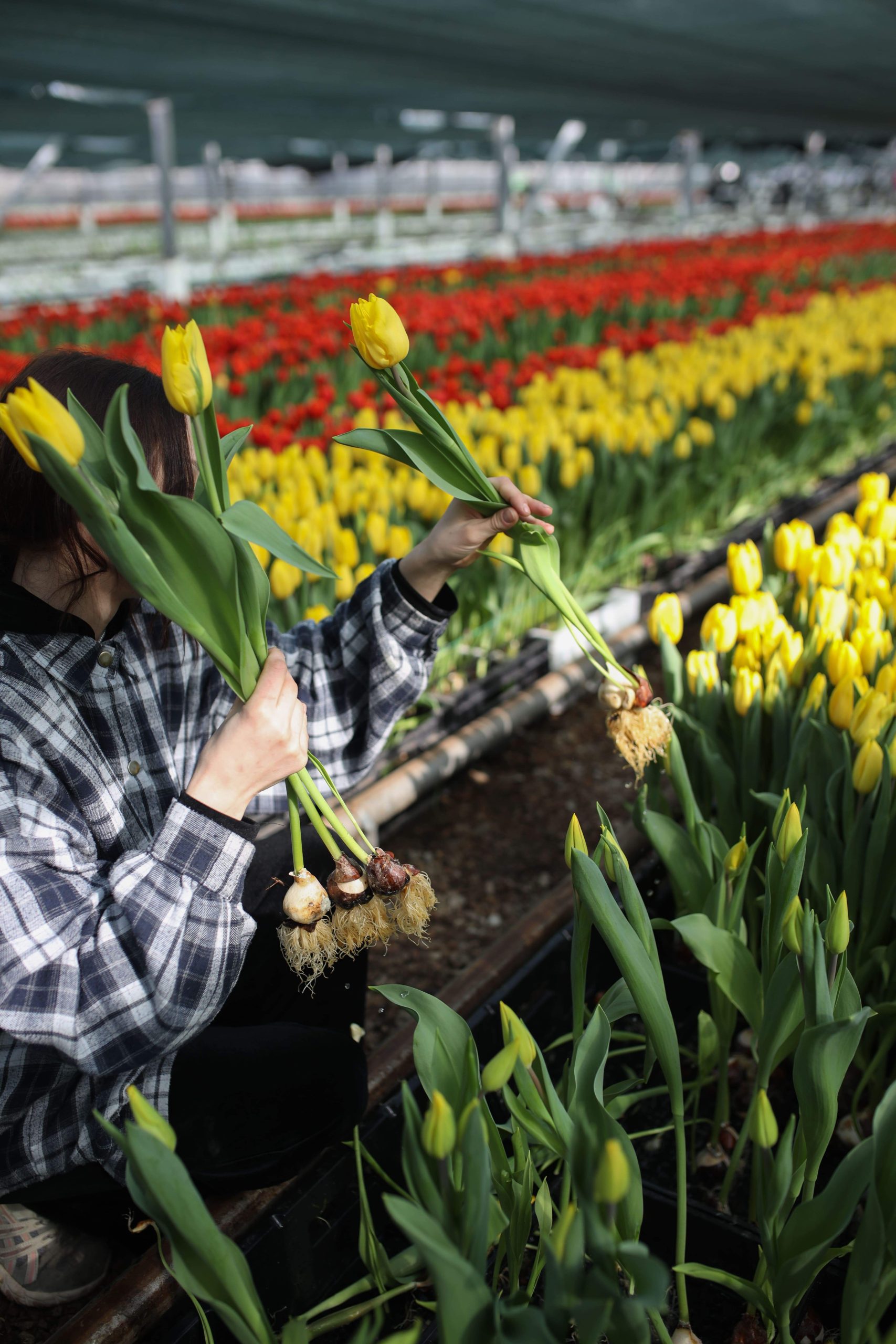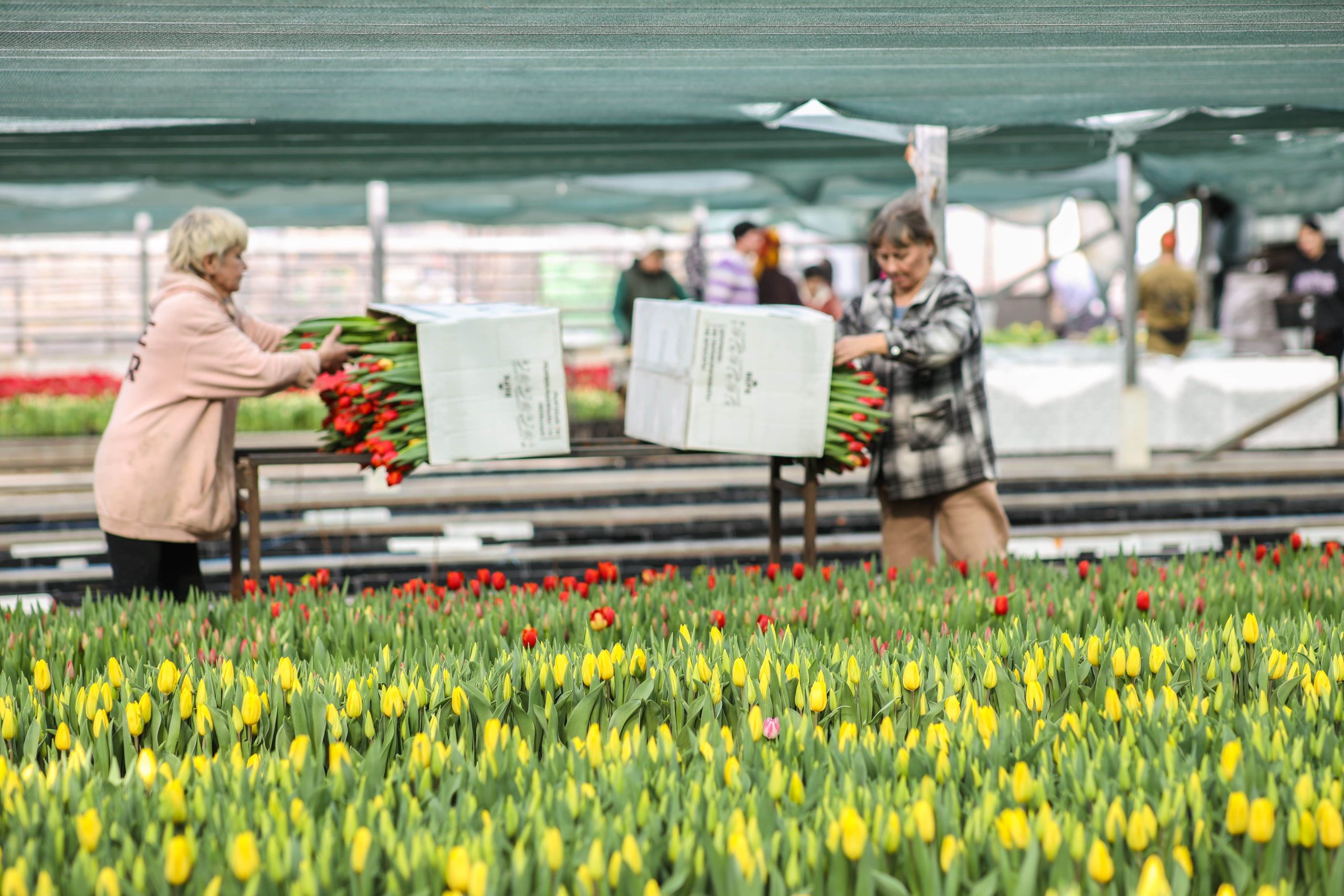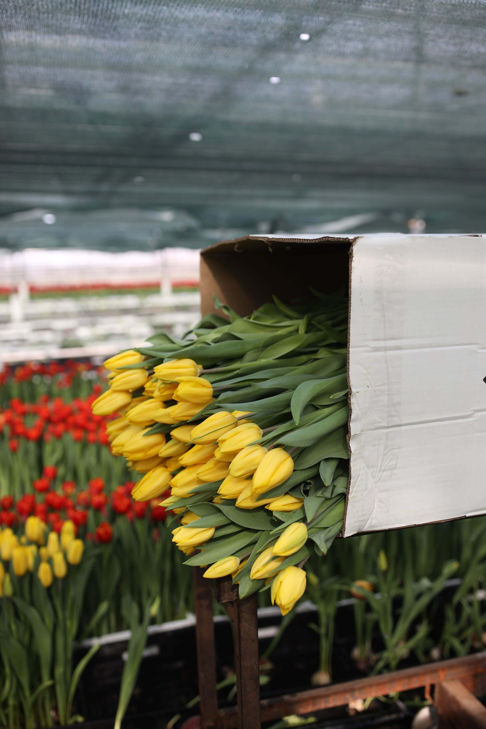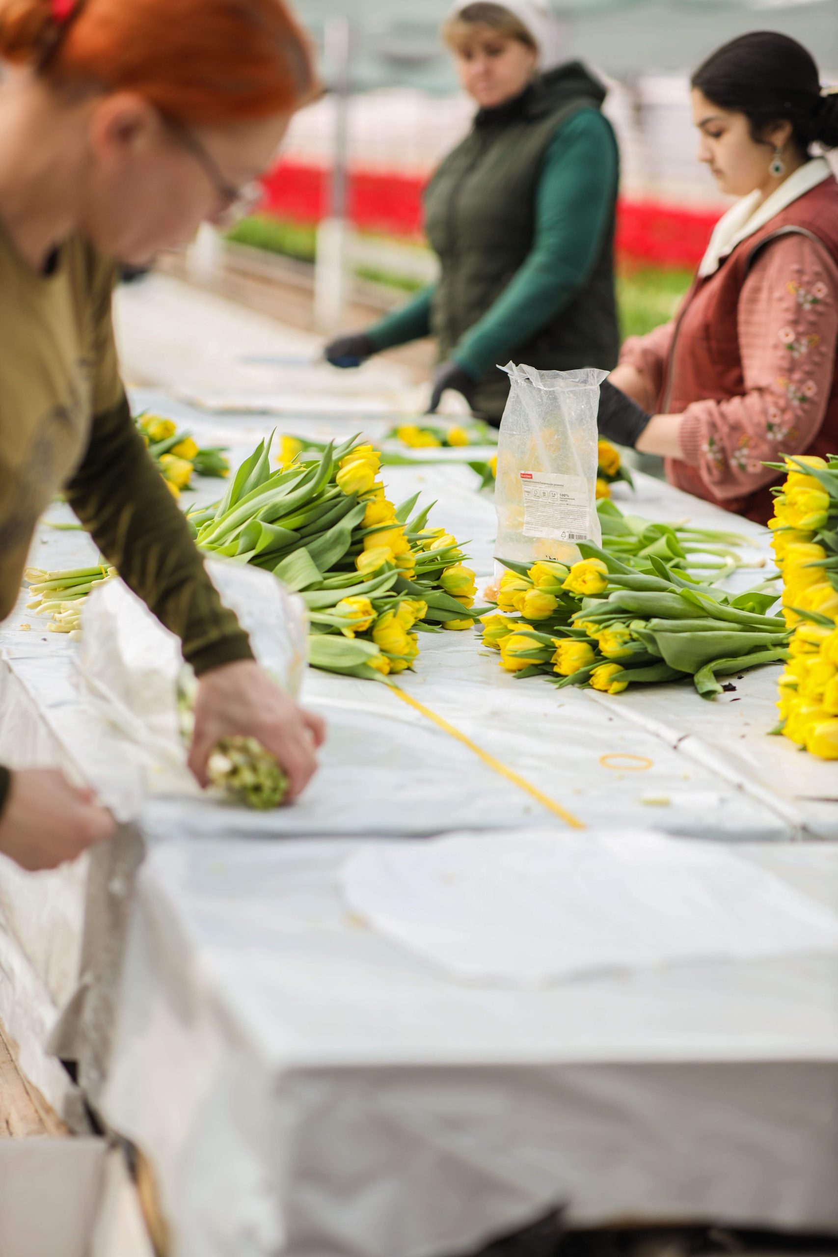 — Цветы растут в огромной теплице при постоянной температуре +12-14 градусов, — рассказывает Максим Веревкин. —  Тюльпаны выращиваются на гидропонике, то есть без использования грунта. Луковица насаживается на иглу, через этот прокол растению поступает питательный раствор. Далее идет процесс укоренения и созревания. Готовый цветок (бутон должен быть обязательно закрыт) срезается вручную вместе с луковицей — так он лучше сохраняется —  и отвозится в холодильник, где охлаждается при температуре – 1+3 градуса. Луковица отделяется от цветка в последний момент – на фасовке.